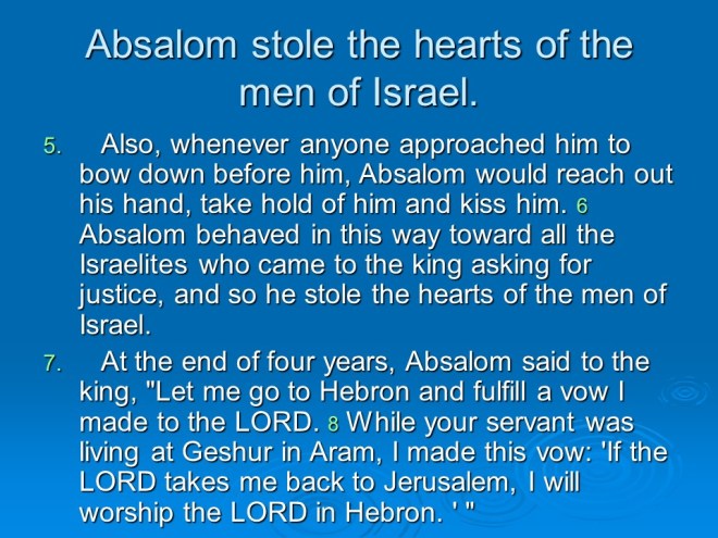 2 Samuel 15. Rather than thanking him Absalom revolted against David, and David escaped from Jerusalem