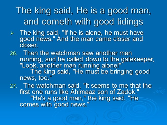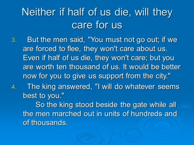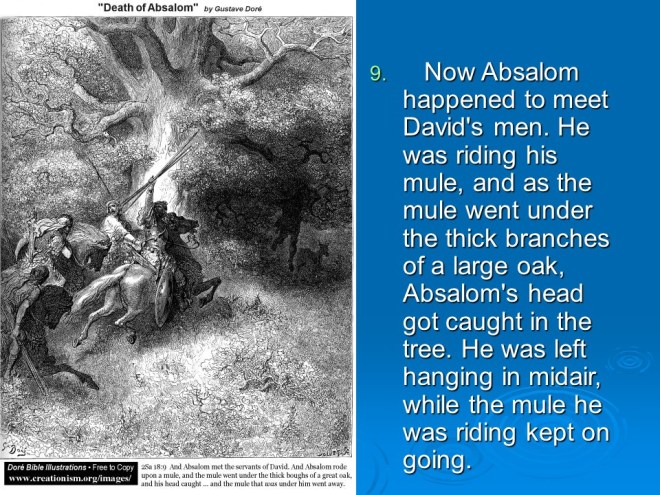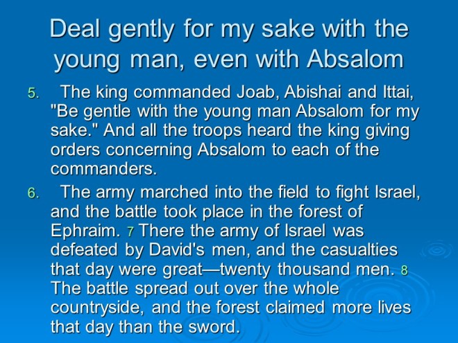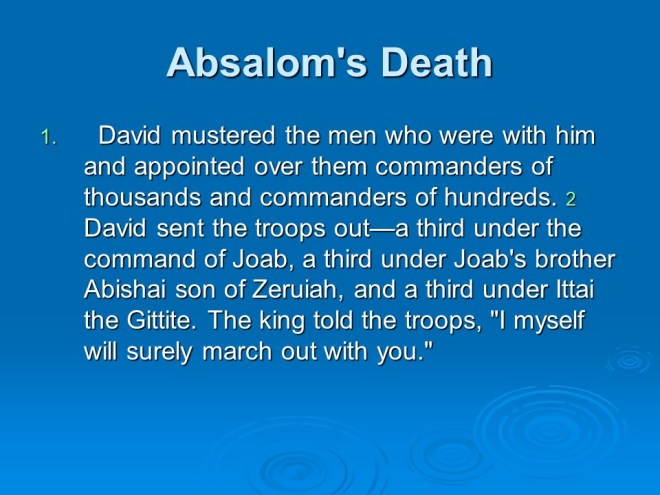 2 Samuel 18. Absalom suffered an inglorious death (read about it). David heard of Absalom’s death and mourned for Absalom.