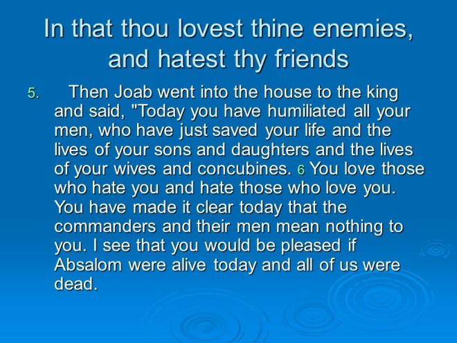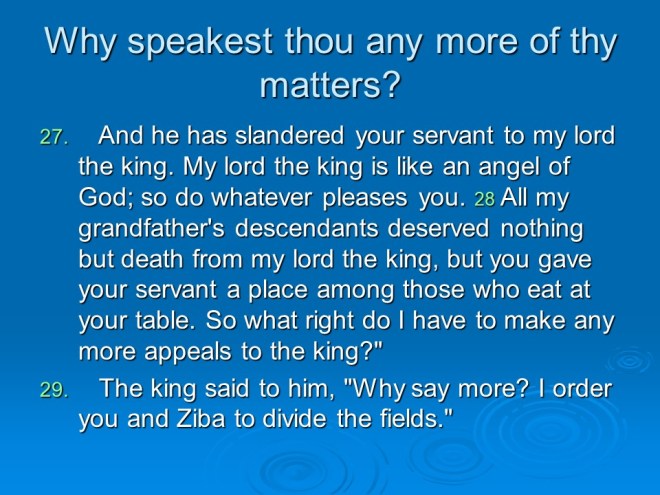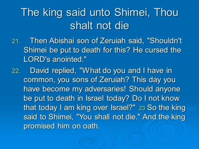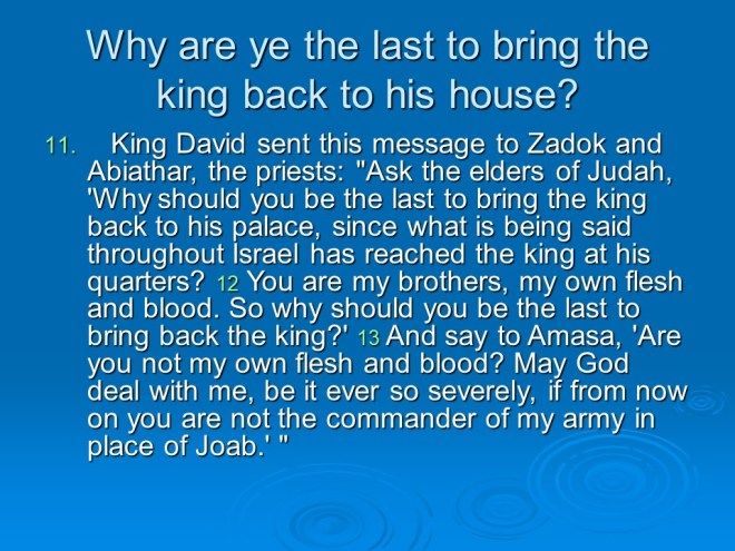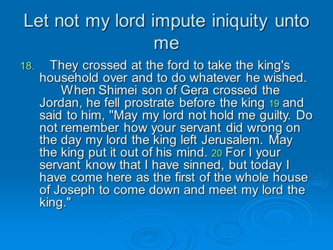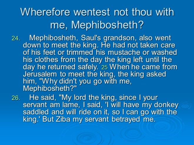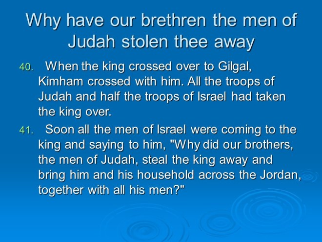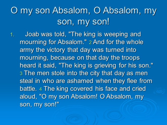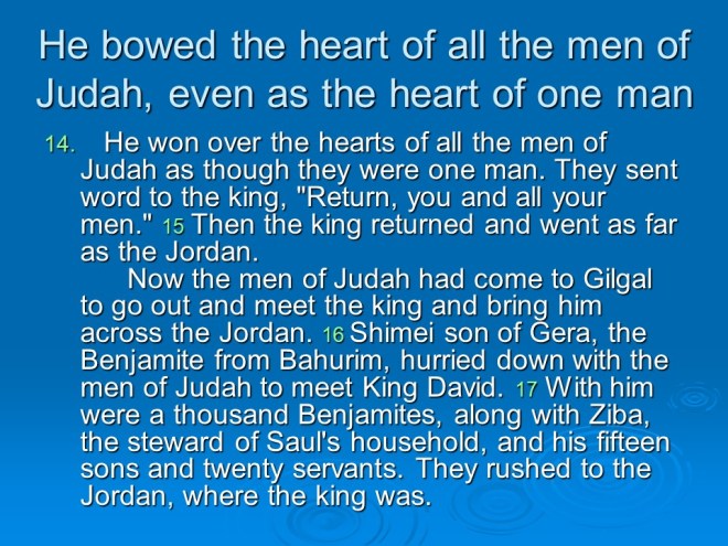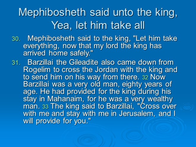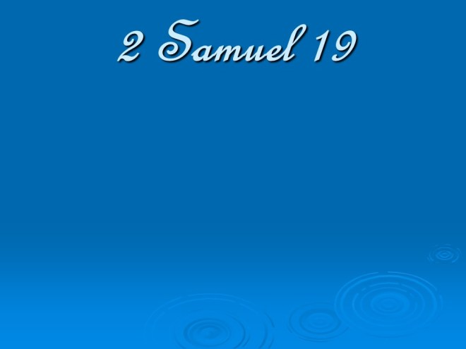 2 Samuel 19, David Mourns for Absalom, David Returns to Jerusalem, David’s Mercy to Shimel, David and Mephibosheth Meet, David’s Kindness to Barzillai, the Quarrel about the King. 2 Samuel 19, David Mourns for Absalom, David Returns to Jerusalem, David’s Mercy to Shimel, David and Mephibosheth Meet, David’s Kindness to Barzillai, the Quarrel about the King.