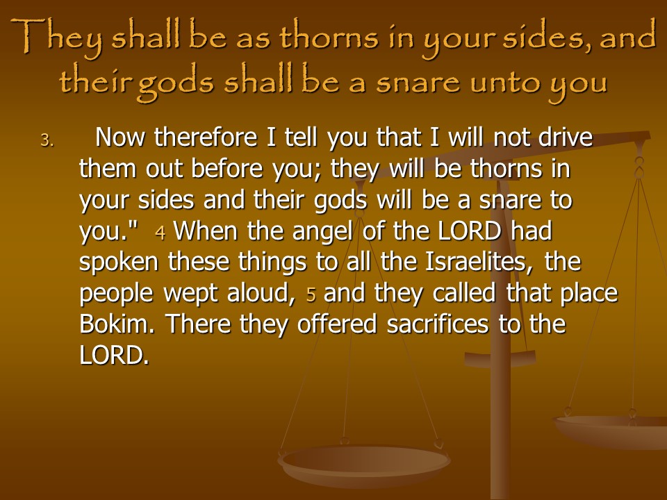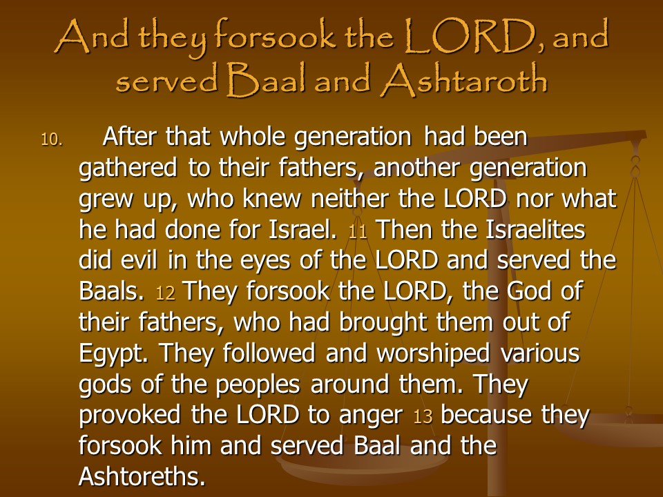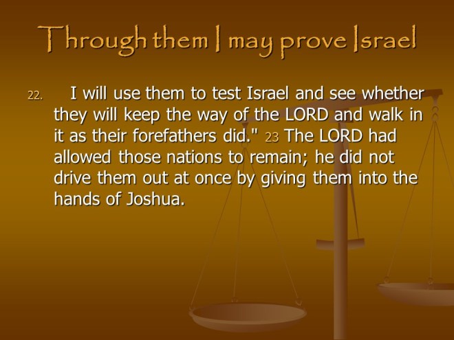 Judges 3. The cycle of straying from the LORD and coming back to Him began for the nations remaining in the land. Israel did evil in the sight of the LORD and He raised up Judges: Othniel, Ehud, Shamgar, and during their time there was peace in the land for 40, then 80 years.