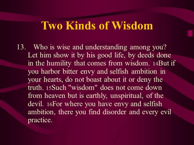 James 3:13-18. There are two types of wisdom, heavenly wisdom, coming from God and earthly wisdom coming from man and it can even be demonic. Heavenly wisdom produces peacemakers, earthly wisdom, not so much.