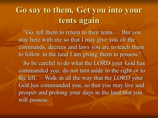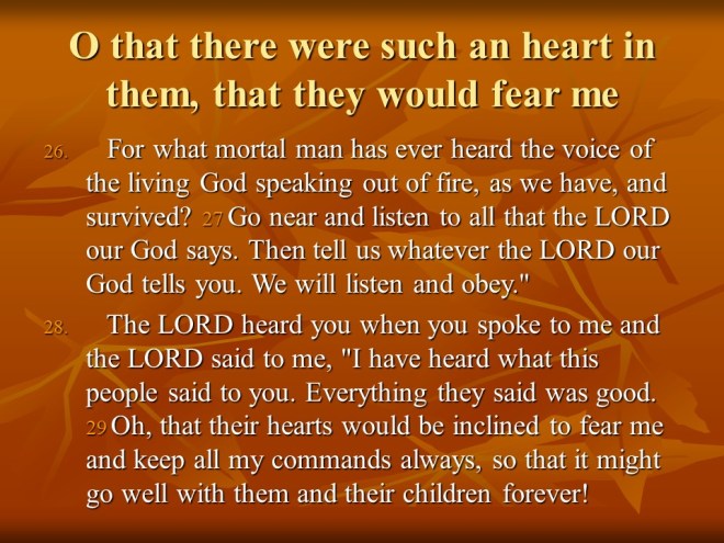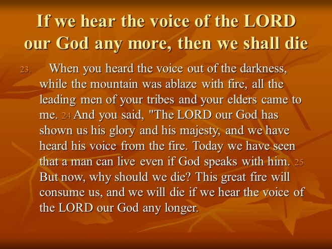 Deuteronomy 5. The Ten Commandments were enumerated a second time, the first time was in Exodus 20. The people were afraid of God’s presence, they were horrified but not in reverential fear.