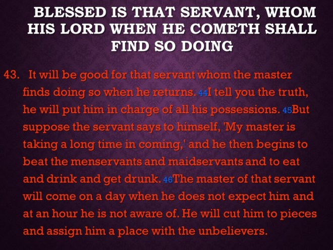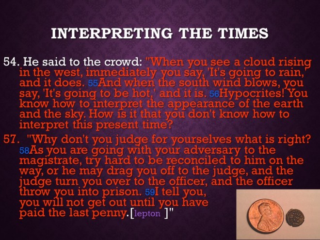 Luke 12, beware of Hypocrisy, the Fear of God, confess Christ, the Rich Fool, do not Worry, the faithful Servant, the Evil Servant, Christ brings Division, discern the Times, Make Peace.