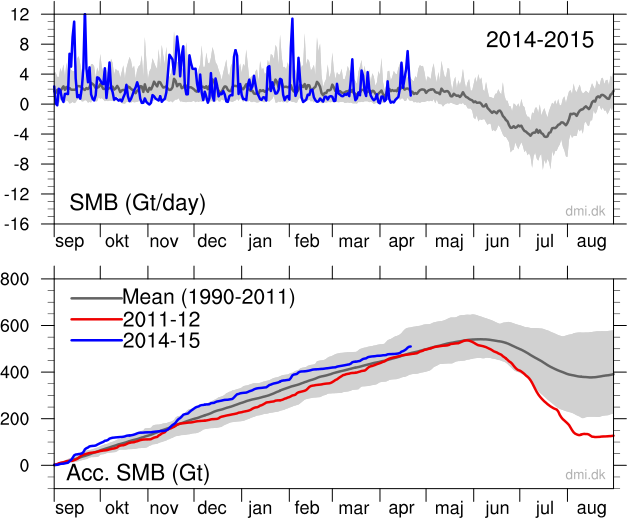 This chart needs some explanation. The total ice mass of Greenland is about 2.85 million Gt. The changes so far this season is an accumulation of about 500 Gt. This will partially melt away during summer, and some ice will be lost through calving, so the net loss of ice has been about 200 Gt per year, at which rate all the ice might be lost in 14250 years. 2014 was the first year in a long time Greenland added ice, and the 2015 season is following the same pattern.
