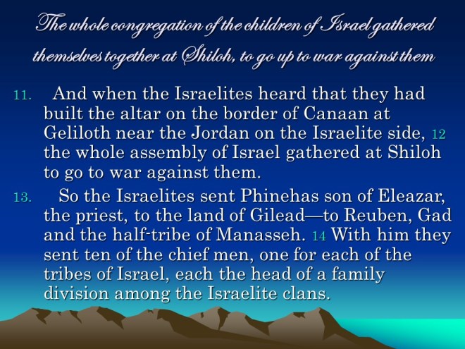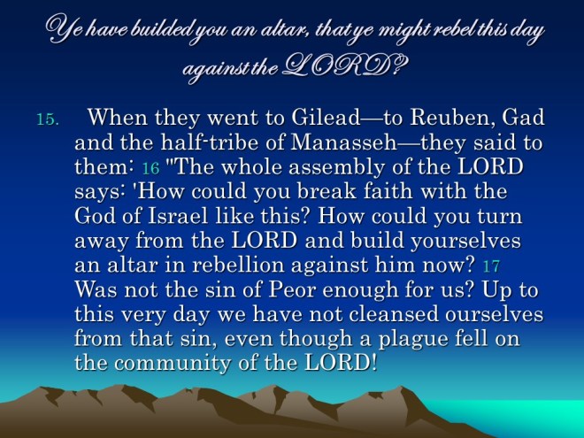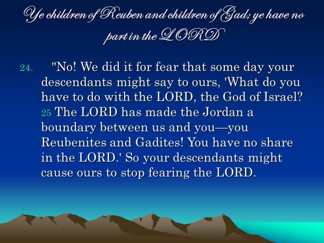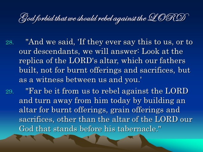 Joshua 22. The Eastern tribes returned to their lands. On their way they built an altar by the Jordan. The Western Tribes thought by doing so they were abandoning the LORD. Not so, they were confirming “it shall be a witness between us that the LORD is God.”