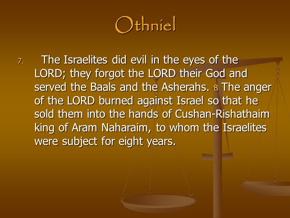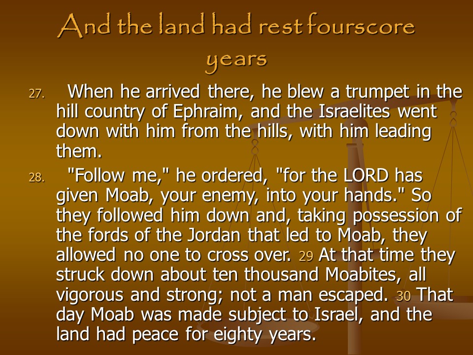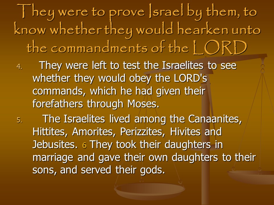 Judges 3. The cycle of straying from the LORD and coming back to Him began for the nations remaining in the land. Israel did evil in the sight of the LORD and He raised up Judges: Othniel, Ehud, Shamgar, and during their time there was peace in the land for 40, then 80 years.