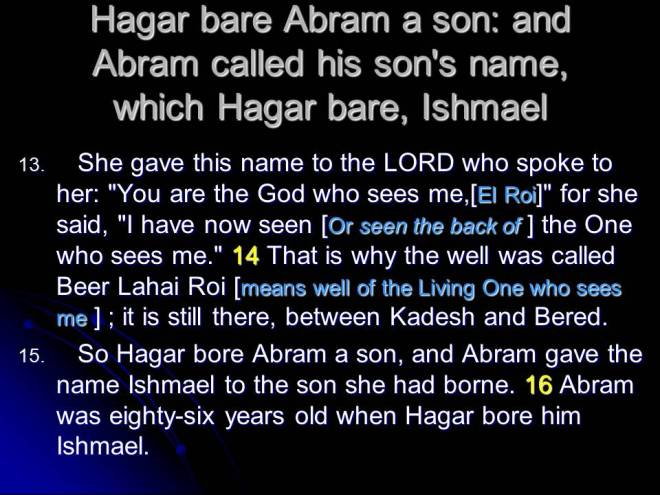 Thirteen years later, in Genesis 17, Ishmael was back with Abram, God promised Abram his seed of promise, changed Abram’s name to Abraham and Sarai’s name became Sarah, established with an eternal covenant, the covenant of Circumcision, and it was performed on Abraham, Ishmael and all Abraham’s male servants.
