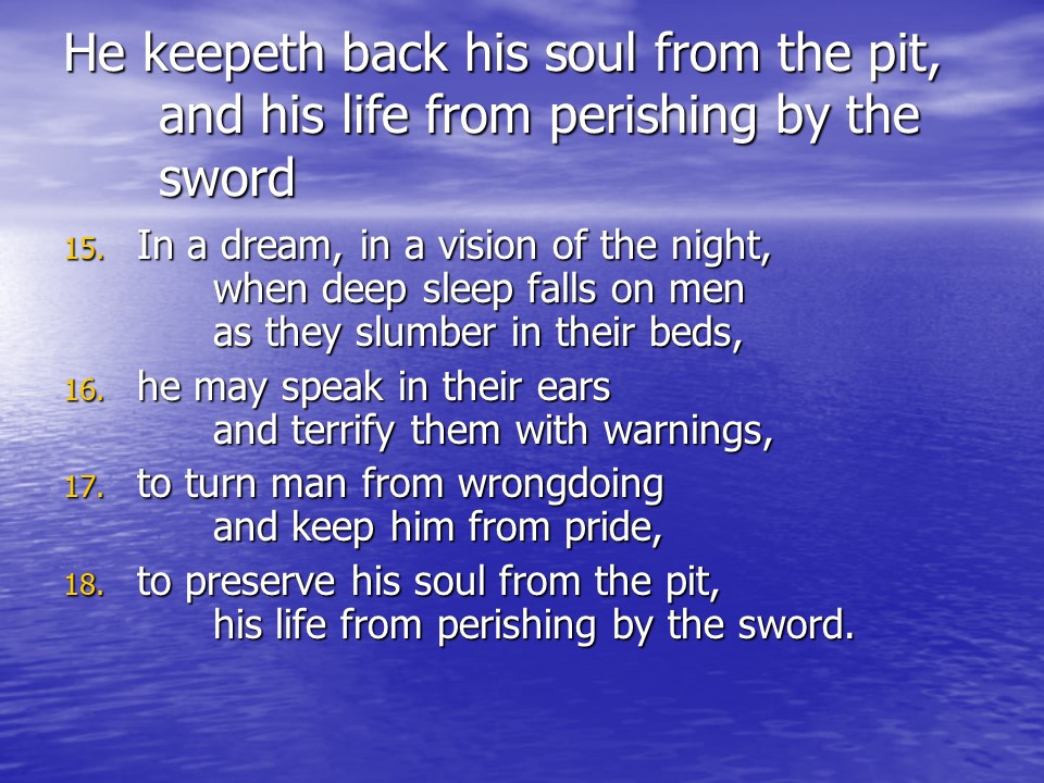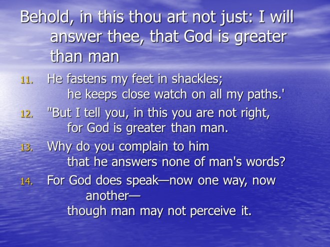 Job 33. Elihu continued, contradicting Job: “No one is righteous before God.”