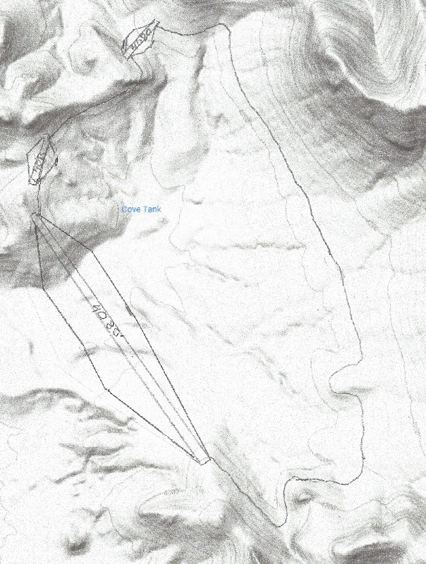 Dam 2 dams the Cove Tank dam. It has a 3,300 feet wide and up to 360 feet high dam, topping out at 4,080 feet, and the lake holds a water volume of up to 110,000 acre-ft. Water is pumped from and released to the upper dam via a 13 mile tunnel