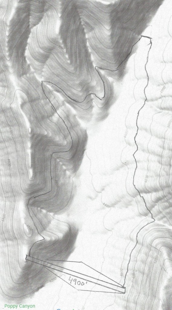 Dam 3 is the Poppy Canyon Lower Dam. It has a 3,300 feet wide and up to 460 feet high dam, topping out at 4,900 feet, and the lake holds a water volume of up to 70,000 acre-ft. Water is pumped from and released to the upper lake 1.8 mile tunnel.