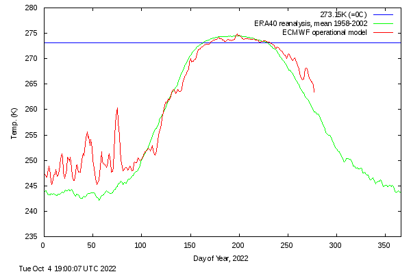 North America has great rivers, none greater than the mighty Mississippi. It used to be a meandering river with frequent floods that resulted in depositing its silt over large areas and thus fertilizing the land. The Indians living by the river moved to its new location after the water receded, and they could use the newly fertilized land. After the Louisiana purchase river traffic grew rapidly, but shifting sandbars and the excessively winding river became a problem, so the Mississippi river was converted to be the main transportation artery of the middle USA, the river banks were reinforced and the course of the river straightened. This meant that more of the silt was transported out into the Mexican Gulf, some of the silt that used to fertilize the soil instead fertilized the Mexican gulf. In addition, the Mississippi river used to be very polluted, but is now clean enough that it can be used for drinking water after treatment all the way down into Louisiana. There remains elevated concentration of nitrogen compounds so the Mexican Gulf suffers from excessive algae blooms and even red tide from time to time. This leads to more cloud formation and more rain in the United States east of the 98th meridian. This also occurs in Northern Europe, especially in the North Sea; the rivers flowing into the North Sea are rich in nutrients. The Baltic Sea was near oxygen death, but after the Baltic countries and Poland joined the EU, their rivers got partially cleaned up. In the far East the Yellow Sea and the South China sea are suffering major pollution. All these regions produce more clouds, and through prevailing winds some end up in the Arctic, where they snow out, except in the Summer when they rain out except on Greenland where it snows 12 months of the year. This leads to increasing winter temperatures of about 5.5 C above the 80th latitude, 2.5 C in spring and fall and a decrease of about 0.5 C in the summer (it takes a long time to melt that extra snow). This affects about 4% of the earth’s surface, so the total temperature increase from over-fertilizing the rivers is 0.04 * 2.5 = 0.1 C. No such effect occurs in the Antarctic. To illustrate the current yearly temperature trend in the Arctic, see this current polar temperature chart:
