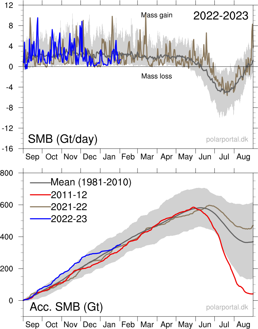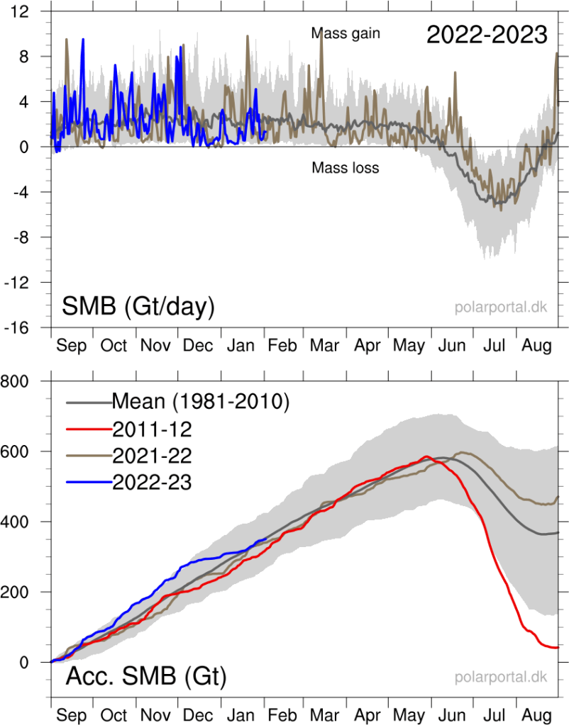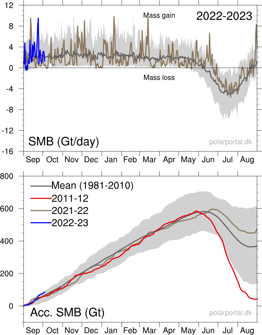 Even more illustrative is the development of ice on Greenland. In 2012 it looked like all of Greenland was going to melt in less than 1000 years, and the polar ice cap would be gone altogether in late summer of 2020. The ice over Greenlnd is now growing ever so slightly again: