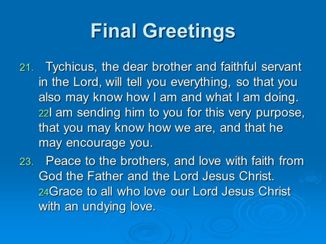 Ephesians 6. Children: Obey your parents; bondservants (employees): Do everything as unto God, put on the whole armor of God and pray in the spirit always for all the saints. The Apostle Paul then added a final greeting, and so ends this inspirational letter to the Ephesians.