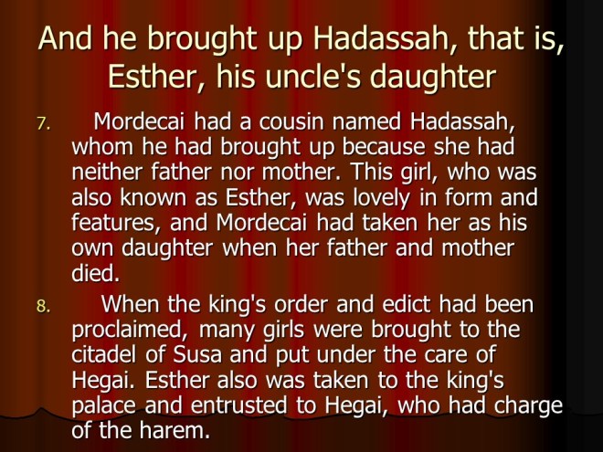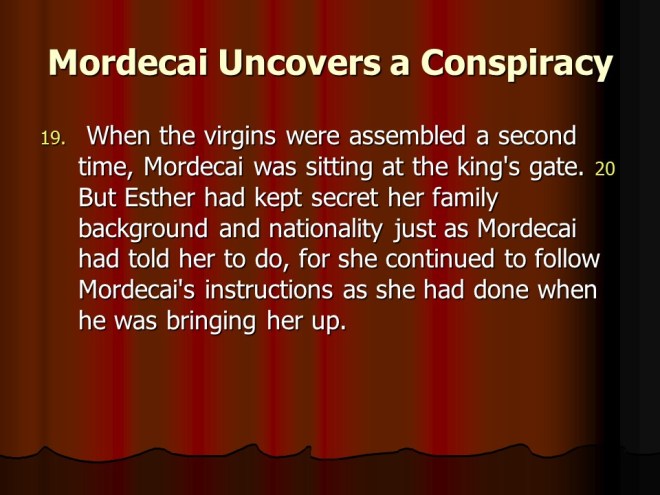 Esther 2. The search for a new queen was on and Esther became the new queen. Mordecai, Esther’s cousin, uncovered a conspiracy against the king.