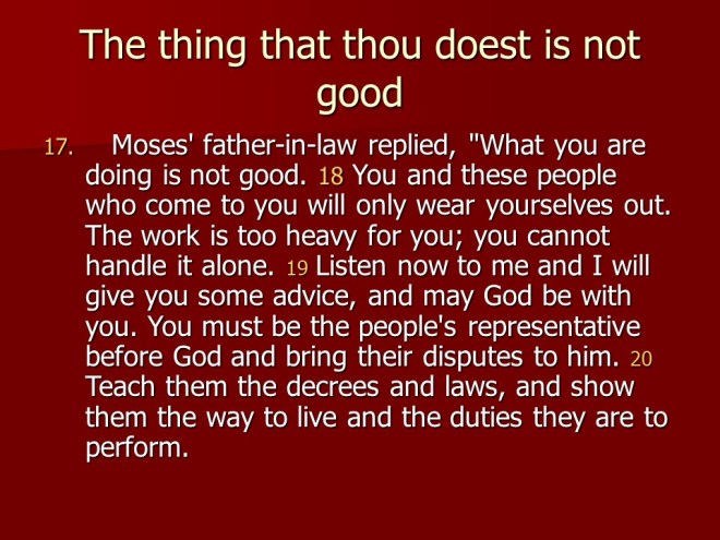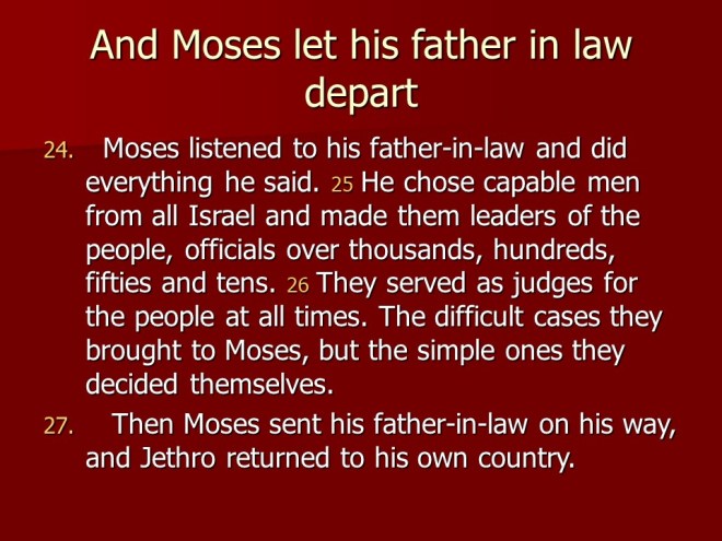 Exodus 18 tells of Jethro, Moses’ father-in-law when he visited Moses, who now was in a difficult situation trying to lead his people all by himself, and Jethro gave Moses good advice about real leadership, delegation of management, a practice essential for all governing.