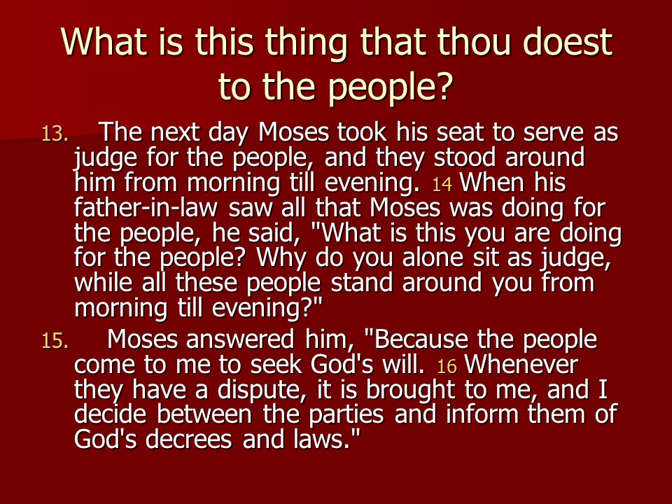 Exodus 18 tells of Jethro, Moses’ father-in-law when he visited Moses, who now was in a difficult situation trying to lead his people all by himself, and Jethro gave Moses good advice about real leadership, delegation of management, a practice essential for all governing.