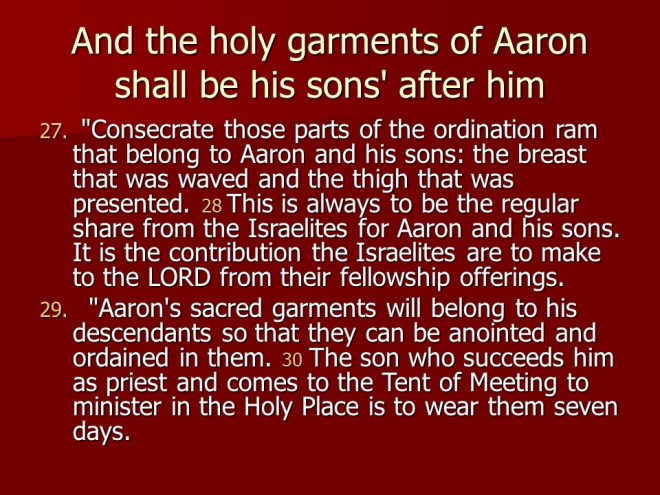 In Exodus 28 the priestly garments are specified, in detail, with the breastplate, down to the urim and thummim, and the plate “HOLINESS TO THE LORD”. Even the undergarments are specified.