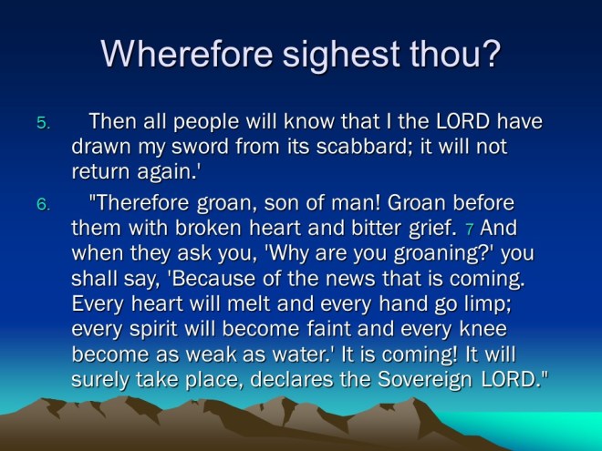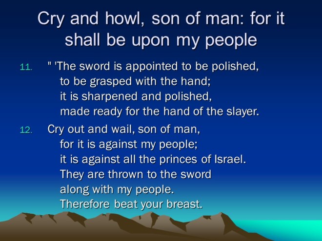 Ezekiel 24. God told Ezekiel to put on a cooking pot, fill it with water and the parts from the best animal, boil it dry, let the kettle burn up the meat completely and char the bones. So shall it be done with the city of bloodshed. Ezekiel’s wife died. Put up a stiff upper lip, Ezekiel!