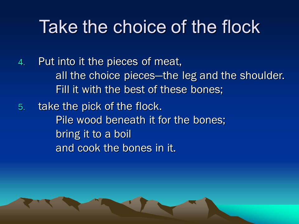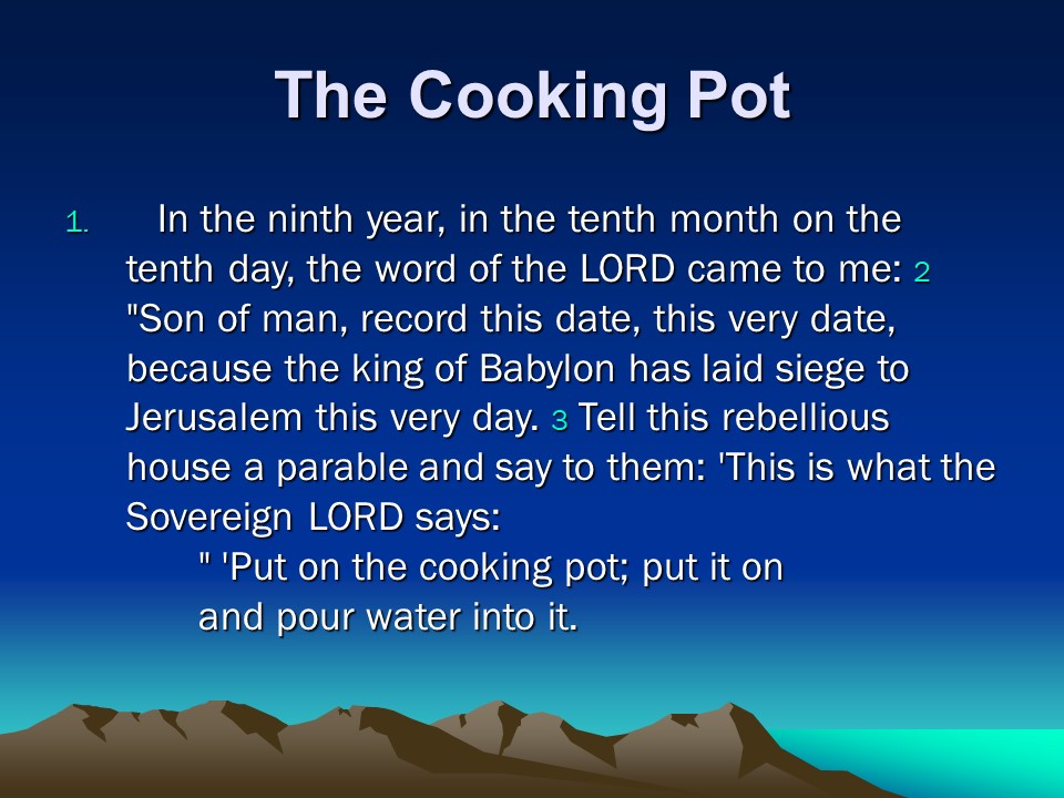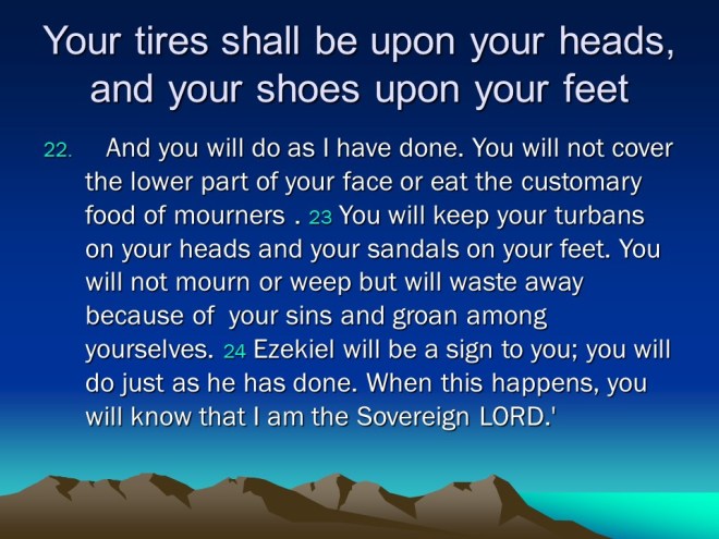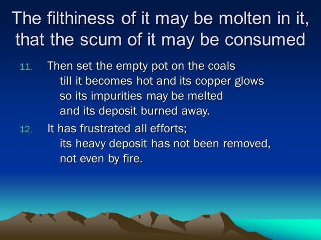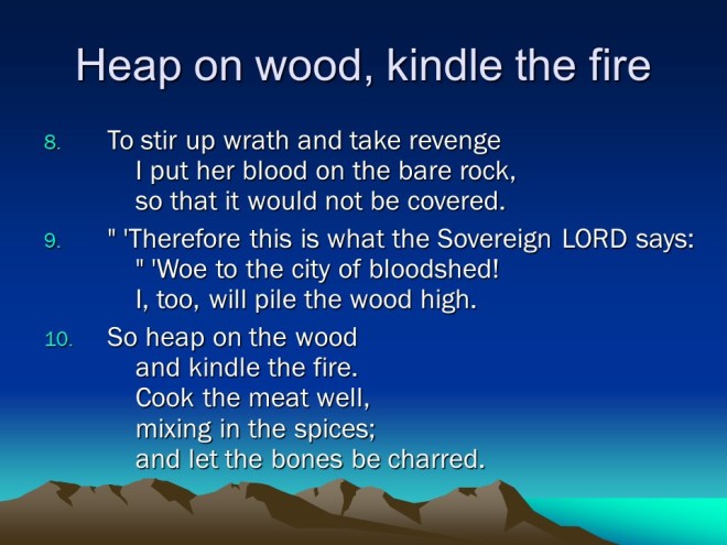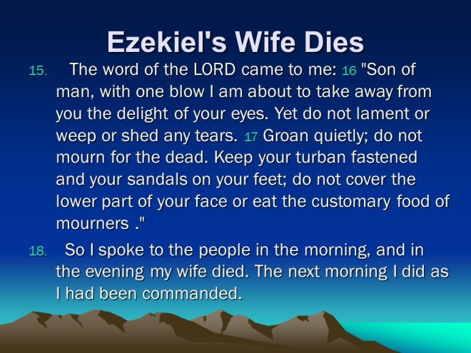 Ezekiel 24. God told Ezekiel to put on a cooking pot, fill it with water and the parts from the best animal, boil it dry, let the kettle burn up the meat completely and char the bones. So shall it be done with the city of bloodshed. Ezekiel’s wife died. Put up a stiff upper lip, Ezekiel!