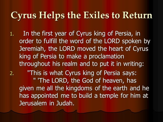 1 In the first year of Cyrus king of Persia, in order to fulfill the word of the Lord spoken by Jeremiah, the Lord moved the heart of Cyrus king of Persia to make a proclamation throughout his realm and also to put it in writing: