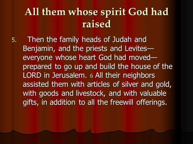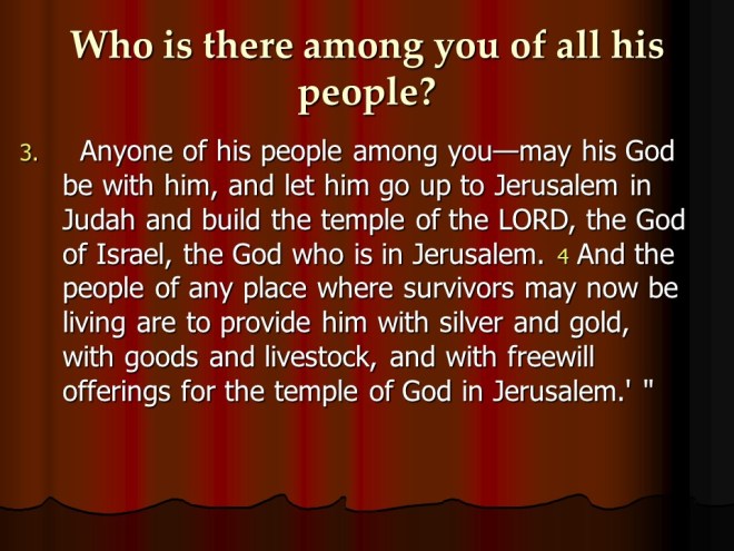 “‘The Lord, the God of heaven, has given me all the kingdoms of the earth and he has appointed me to build a temple for him at Jerusalem in Judah. 3 Any of his people among you may go up to Jerusalem in Judah and build the temple of the Lord, the God of Israel, the God who is in Jerusalem, and may their God be with them. 4 And in any locality where survivors may now be living, the people are to provide them with silver and gold, with goods and livestock, and with freewill offerings for the temple of God in Jerusalem.’”