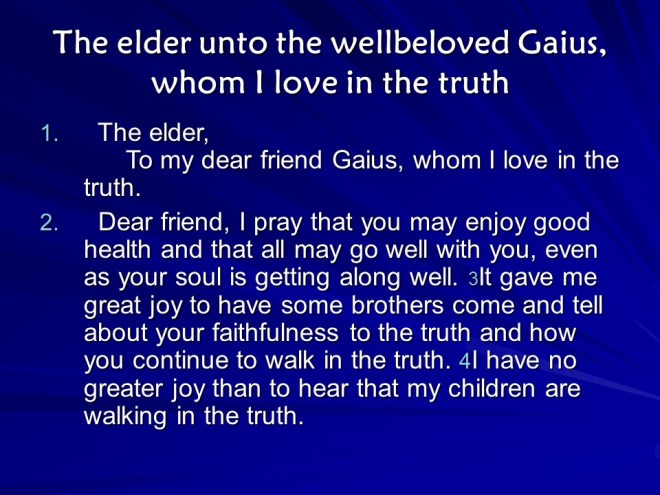 3 John, Greeting to Gaius, Commended for Generosity, Diotrephes, Demetrius, Farewell Greeting. 3 John, Greeting to Gaius, Commended for Generosity, Diotrephes, Demetrius, Farewell Greeting.