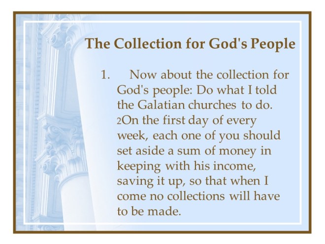 1 Corinthians 16. The Apostle Paul urged the believers to take up collections for the saints in Jerusalem. He mentioned personal plans, gave final exhortations, final greetings and finally bid farewell.