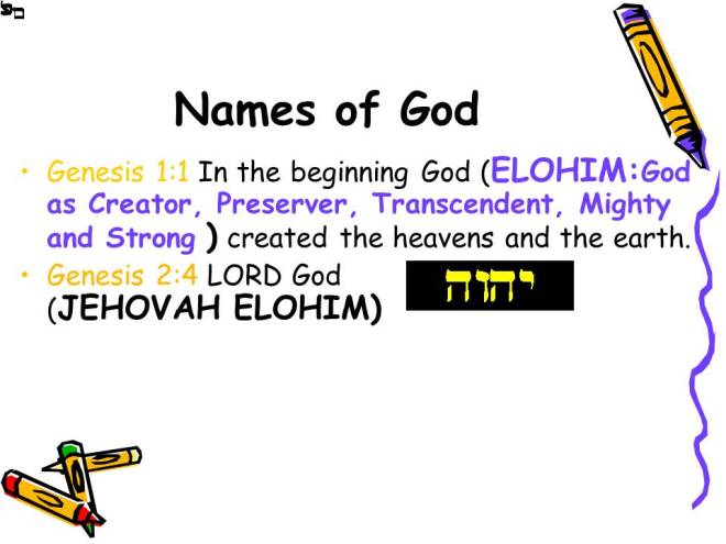 Jews and Christians have Jahwe or Jehovah as the main name for God, since Elohim just means “the strongest strong one” and is valid for any God. This is where Islam parts from Judeo – Christian belief, not accepting Jehovah, only Allah, (and 98 more names for God, the hundredth being known only to Allah himself.)