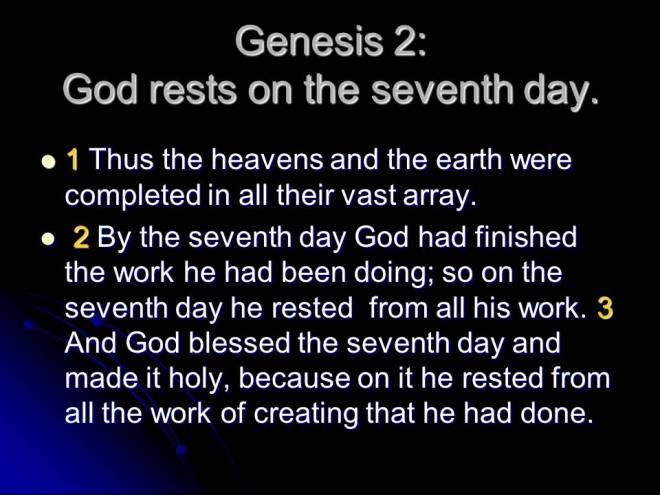 And this is the reason we are having a seven day week, starting with what we call Sunday, or more precisely Saturday evening after sunset, and ending the seventh day with a day of no creative work. This is called sabbath.