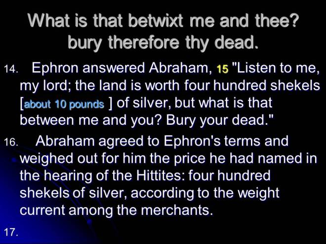 In Genesis 23 Abraham’s wife Sarah died and Abraham purchased a grave in Mamre, where he buried her.