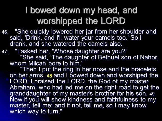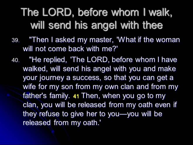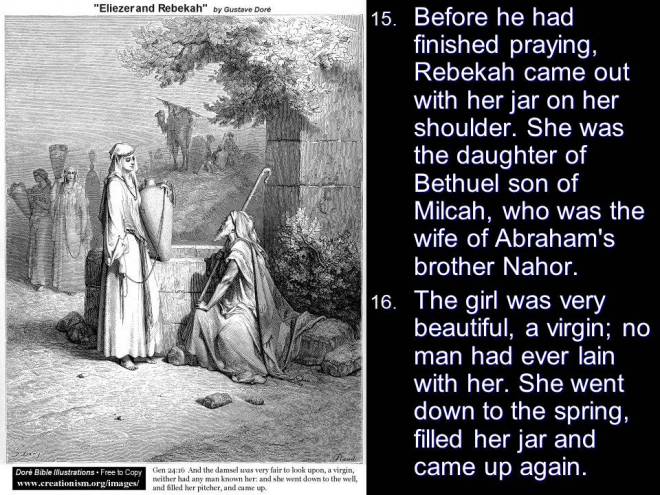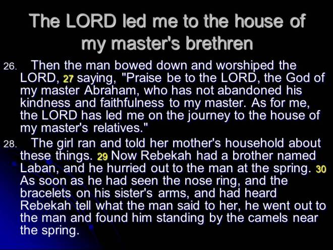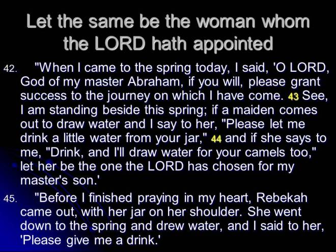 The connection with the Old and New testament is again water. The blind man was told to wash in the pool of Siloam. The man obeyed and the sign was completed. In Genesis the sign to look for was if the damsel would draw water for the camels too. (they are thirty when they haven,t had any water for days).