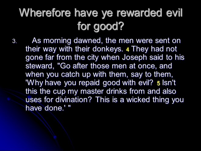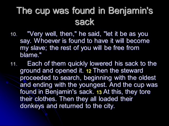 Genesis 44 tells how Joseph tested his brothers by having Joseph’s own silver cup placed in Benjamin’s sack as the brothers returned back to Canaan. They all passed the test and returned to Joseph to await his judgment.