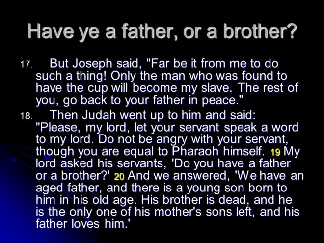 In Genesis 42 there was famine in Canaan, as happened quite often, so Joseph’s brothers went down to Egypt to buy food. They met Joseph, now governor of Egypt, and he demanded to see Benjamin, who was left behind with Jacob. They agreed to do so and left one of the brothers behind as collateral. Joseph was very distraught at the proposition, since Joseph and Benjamin were his favorite children.