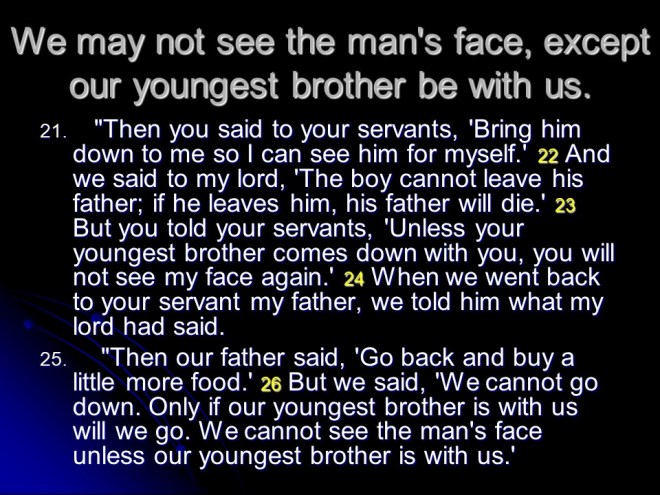 And in Genesis 43 the famine continued, so they had to go back to Egypt for more. This time they had to bring Benjamin with them to keep their promise to Joseph. Joseph gave them all food from his table, and he gave a five times larger portion to Benjamin. So ends that chapter.