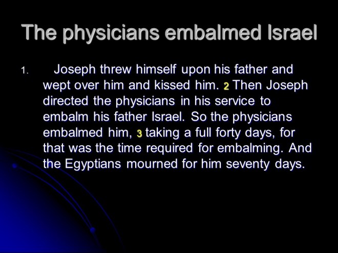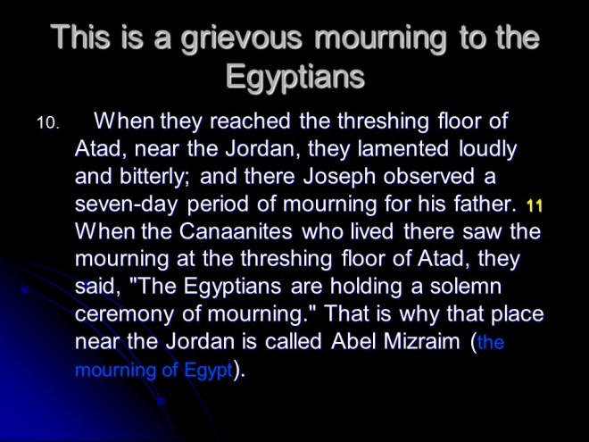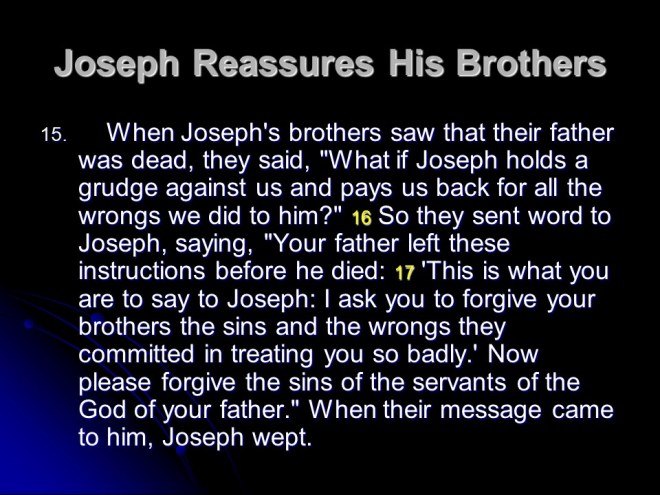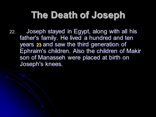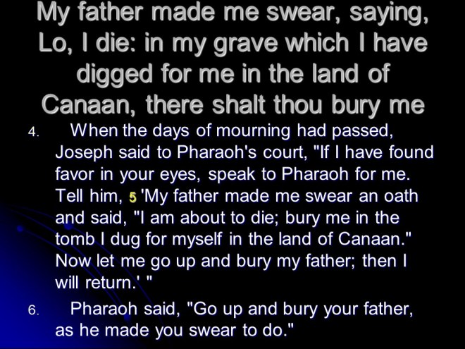 And finally, Genesis 50 tells how Jacob was buried back in Canaan near Mamre where Sarah, Abraham and Rebecca also were buried. Joseph forgave his brothers; “Ye thought evil against me, but God meant it unto good”. Finally even Joseph dies, and he wills that his bones will be carried out when they depart Egypt and enter into the promised land.