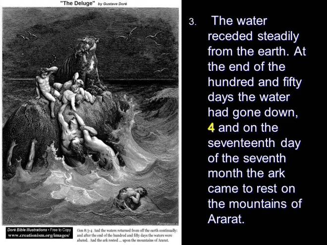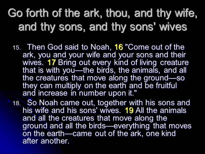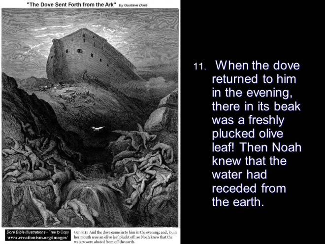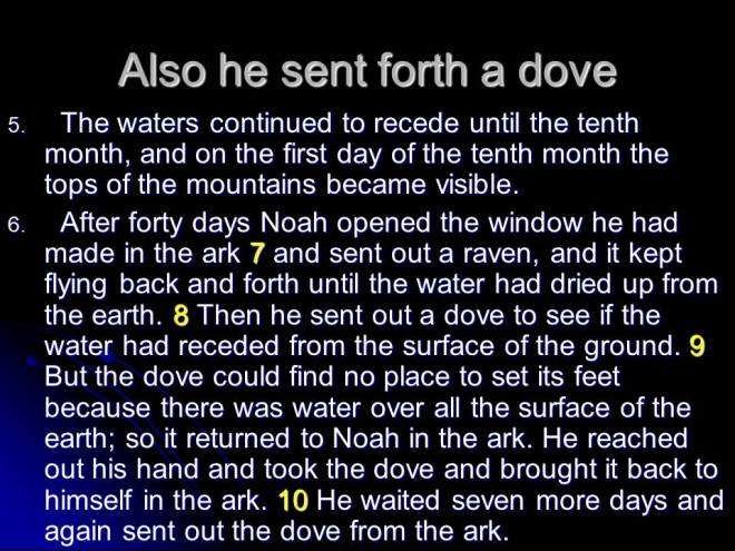 Genesis 8. The water receded and Noah sent out a raven and later a dove that returned empty. The second time the dove was sent out, it returned with an olive branch in its beak. The dove has since become the universal peace symbol. After exiting the ark Noah built an altar and sacrificed from the clean animals. God made a promise to Noah: “While the earth remaineth, seedtime and harvest, and cold and heat, and summer and winter, and day and night shall not cease.”