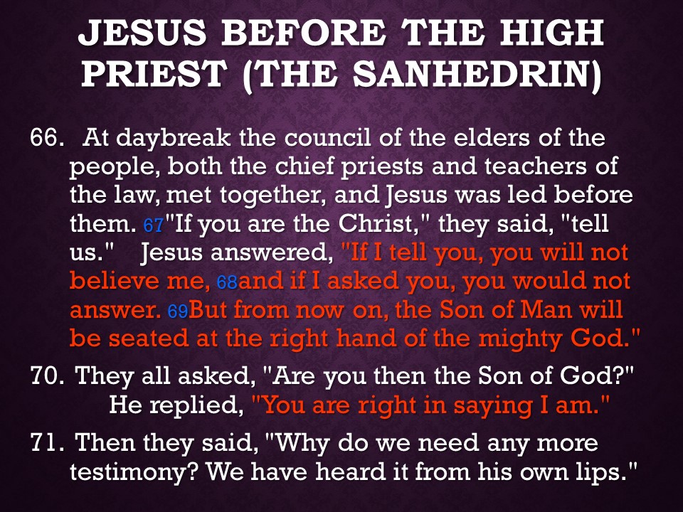 Luke 22:39-65. After Jesus shared the Last Supper with his disciples they went to the garden of Gethsemane where Jesus prayed. While they were there Jesus was betrayed, arrested and taken to the house of the high priest. Waiting outside, Peter disowned Jesus three times before the cock crowd. Jesus was interrogated during the night and before daybreak the Sanhedrin had heard enough and were ready to sentence him to death, but only the Romans had the right to execute a death sentence, so they could only express their frustration.