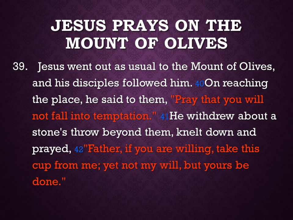 Luke 22. Judas agrees to betray Jesus, it is Passover so Jesus eats  the Last Supper with his disciples, after which they go to the garden of Gethsemane where Jesus prays. While there Jesus is betrayed, arrested and taken to the house of the high priest. While waiting outside Peter disowns Jesus three times before the cock crows. Jesus is interrogated during the night and before daybreak they have heard enough.