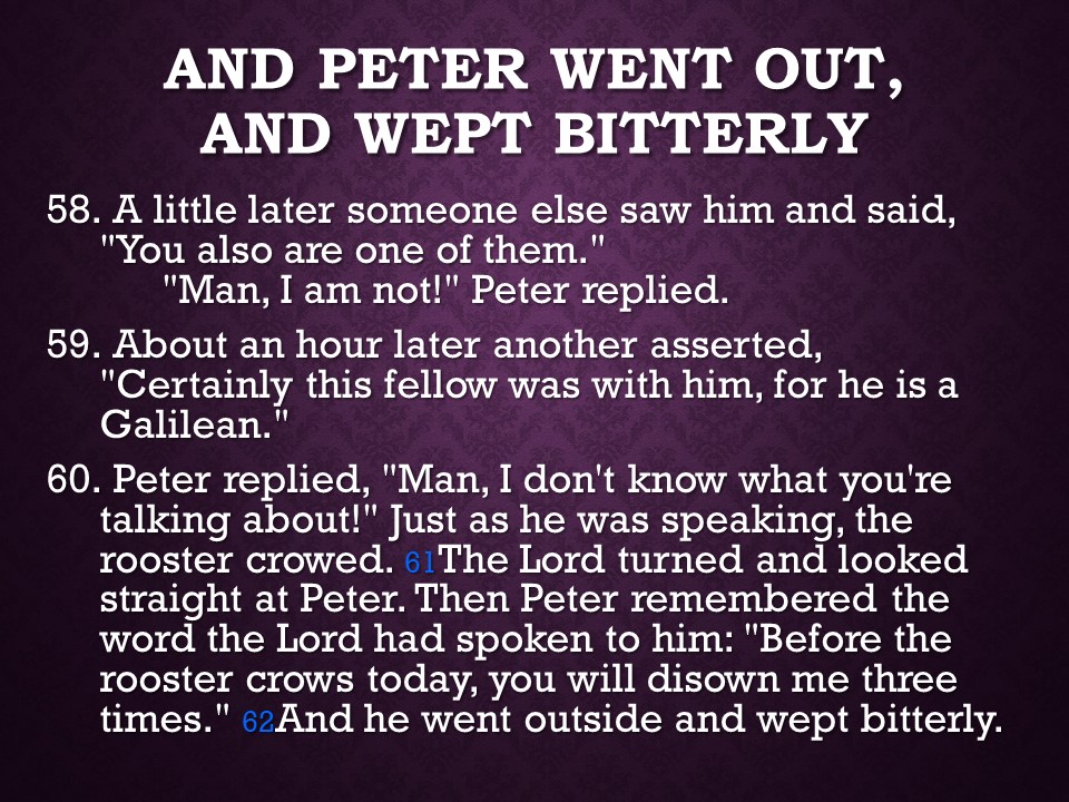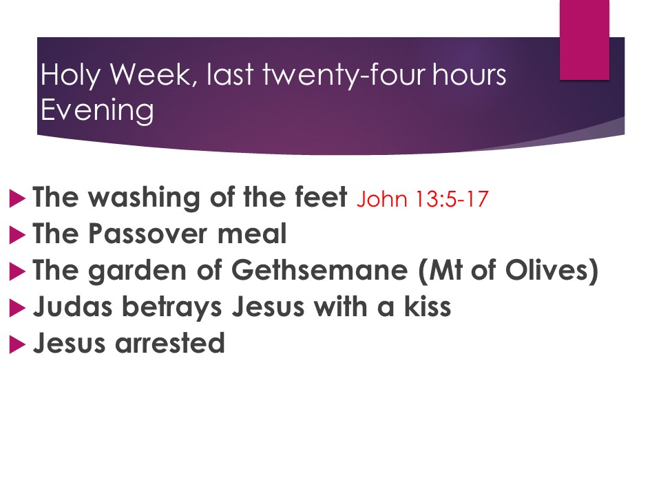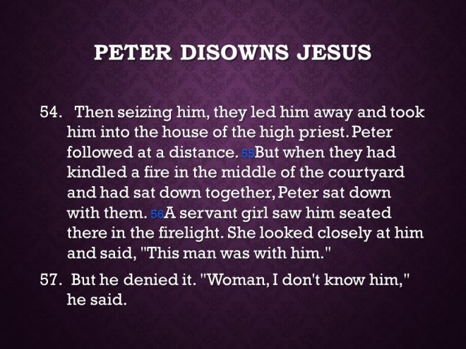 John 18:1-27 deals with some of the last 24 hours of Jesus life, the prayer in the garden of Gethsemane and the subsequent arrest of Jesus, the trial before Annas, Peter’s first denial, Jesus trial before Caiaphas, Peter’s second and third denial and the cock crowing.