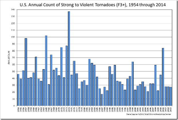 In this picture number of strong tornados (EF>=3) are plotted versus CO2 level, not time, but the trend is clear; the higher the CO2 concentration, the lower the number of tornadoes.