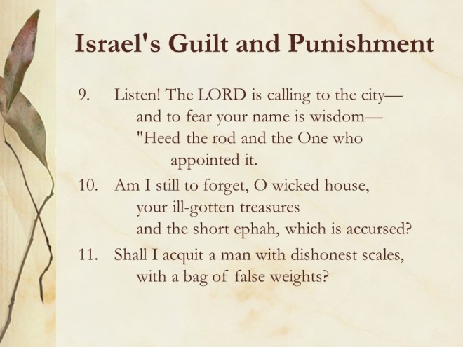 Micah 5. The promise of the coming Messiah: “But thou, Bethlehem Ephratah, though thou be little among the thousands of Judah, yet out of thee shall he come forth unto me that is to be ruler in Israel; whose goings forth have been from of old, from everlasting.” But first, God promised punishment of Israel’s injustice.