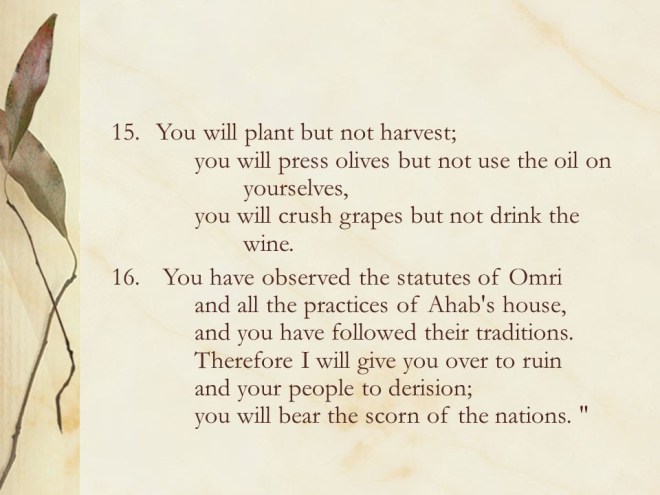 Micah 5. The promise of the coming Messiah: “But thou, Bethlehem Ephratah, though thou be little among the thousands of Judah, yet out of thee shall he come forth unto me that is to be ruler in Israel; whose goings forth have been from of old, from everlasting.”  But first, God promised punishment of Israel’s injustice.