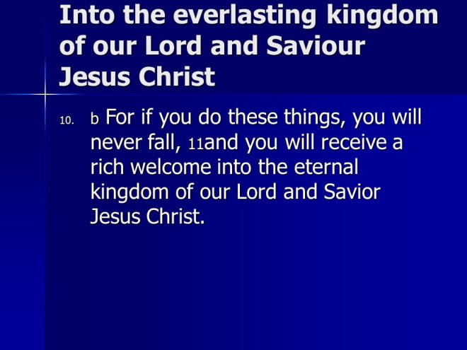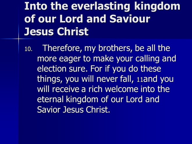 2 Peter 1:1-11. The Apostle was greeting the faithful, urging them to be fruitful in the faith as they apply the eight godly virtues. Peter reminded them of his approaching death and kept emphasizing the trustworthiness of the prophetic word.