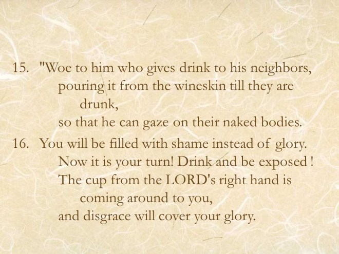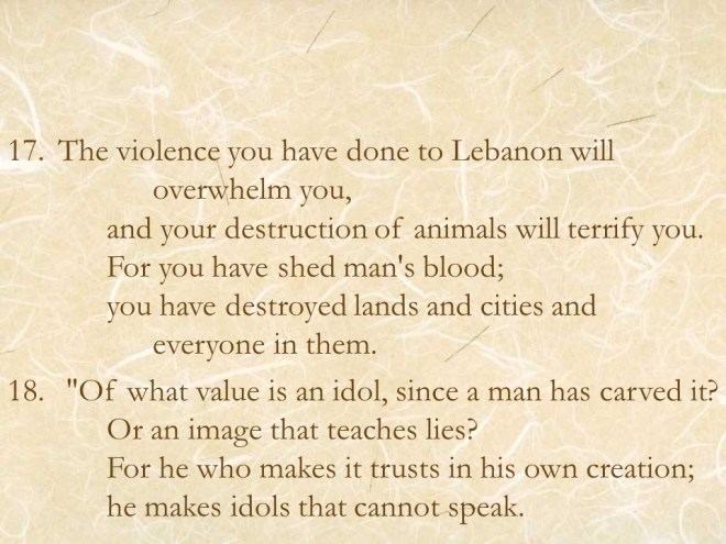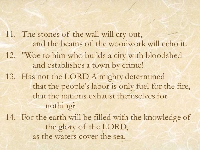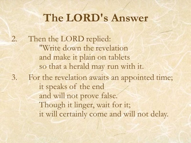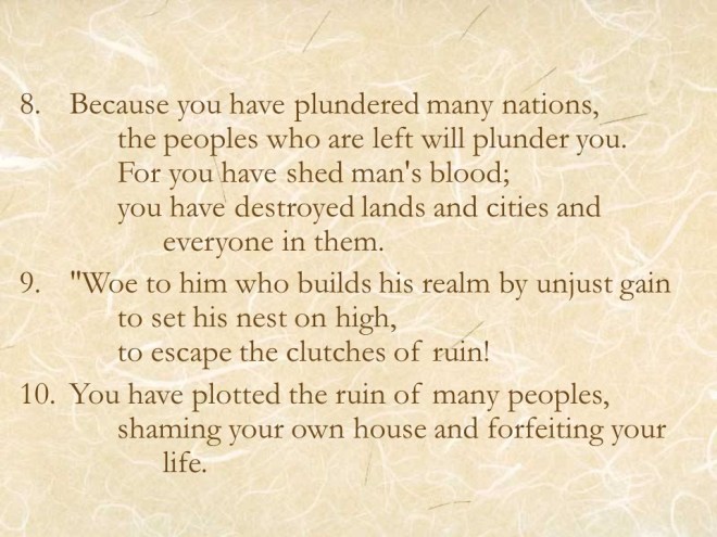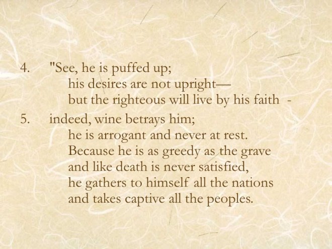 Habakkuk 2. The LORD answered the prophet to his second complaint. It contains this gem, just as valid today as it was then: “The just shall live by his faith“. On the other hand God promised more woes to the wicked.