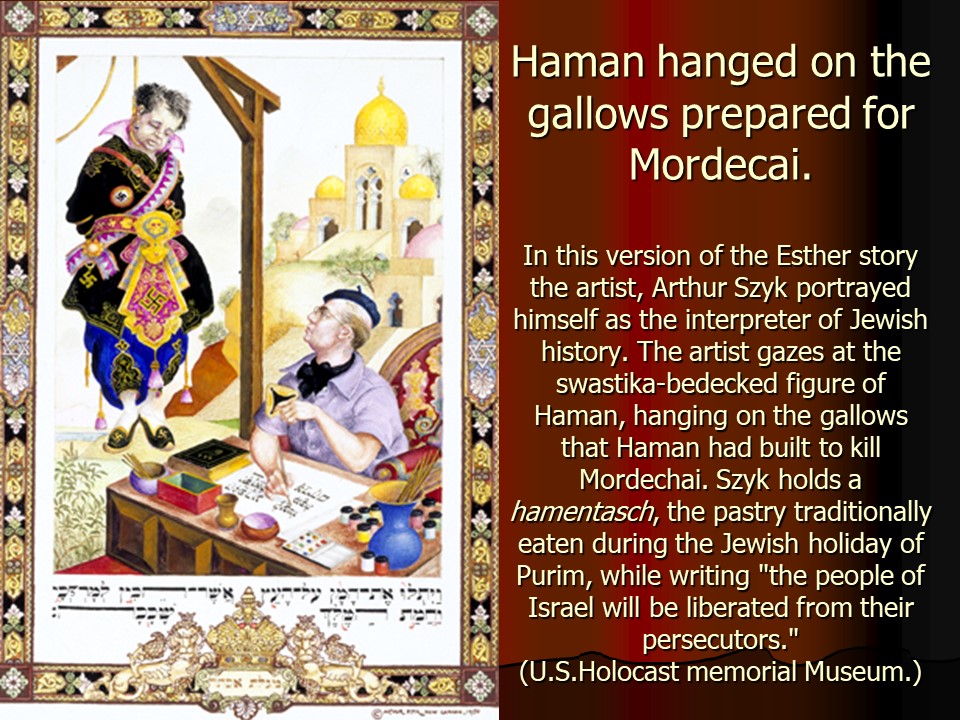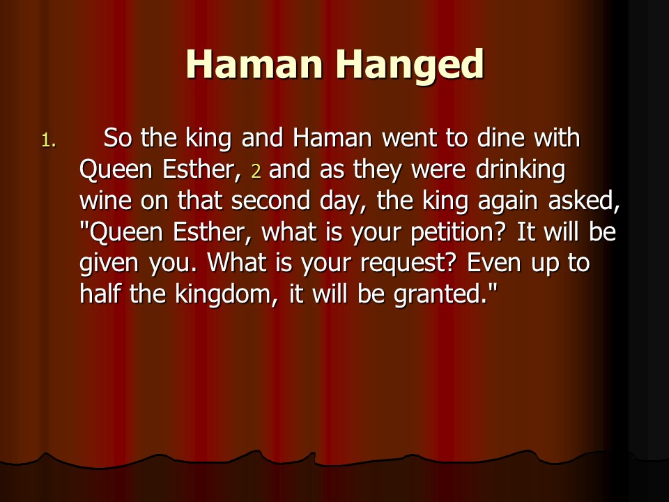 Esther7. And so it was, Haman was hanged on the gallows he had built for Mordecai.
