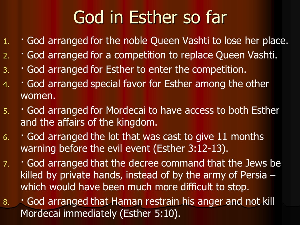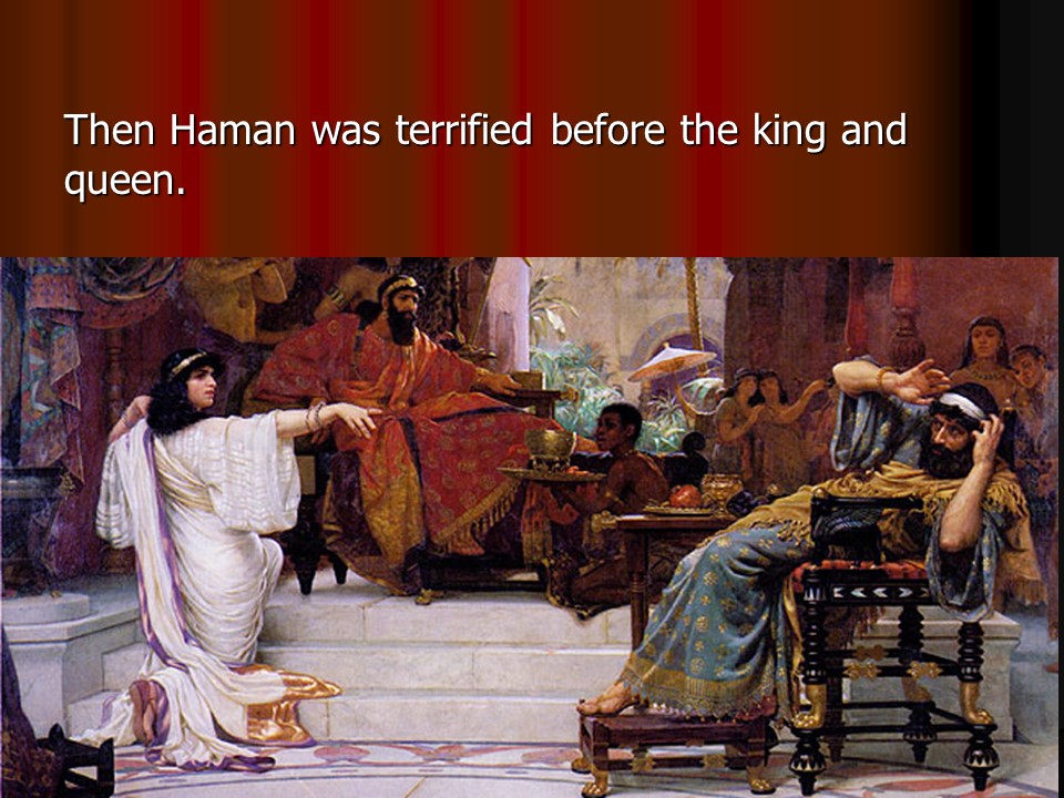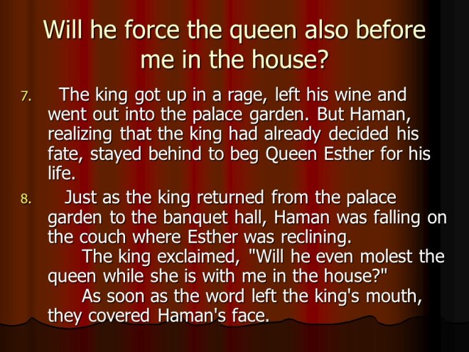 Esther 6. As it so happened, the king had a case of insomnia. To become drowsy he had the annals read to him, which told that Mordecai had averted a coup. During the banquet the king wanted to honor somebody, and rather than Haman, Mordecai was honored.