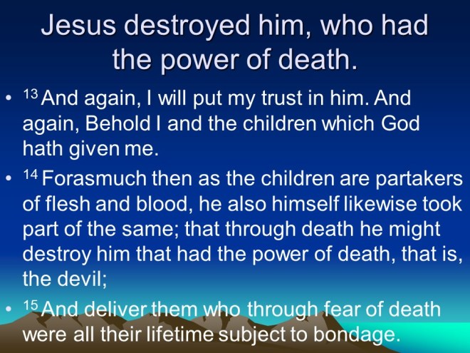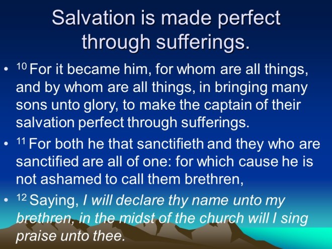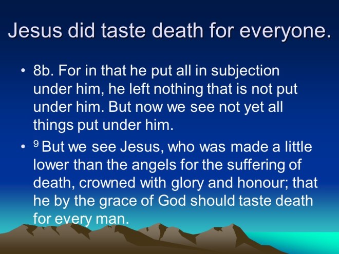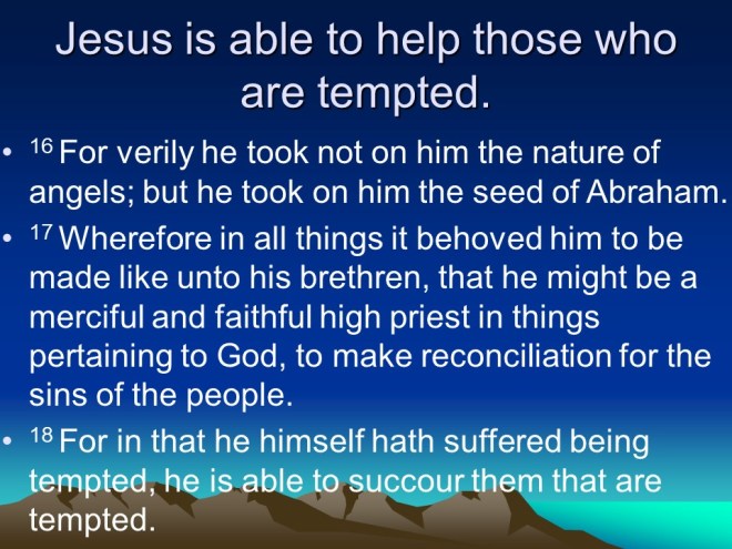 Hebrews 2. Do not neglect so great a salvation. God cannot die, He is eternal, but He had to be made a little bit lower than the angels, in the form of man, so that he could die. And so Jesus had to endure sufferings, even taste death for our redemption. He was in every way tempted just like we are, and emphasizes with us in our temptations and trials. Praise God!