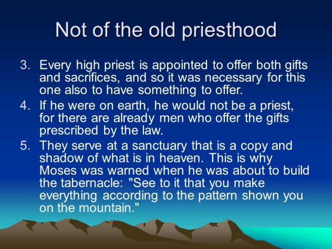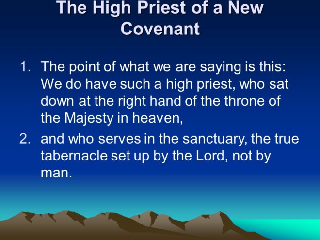 Hebrews 8. Jesus, among all other things is forever the High Priest of the New Covenant.
