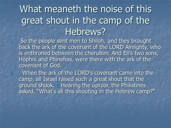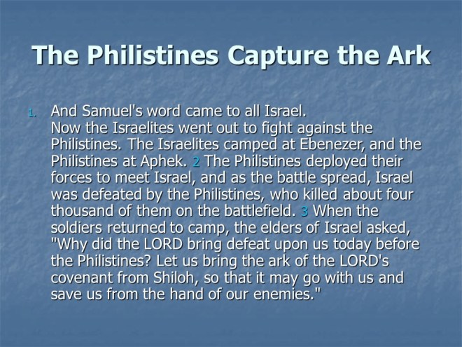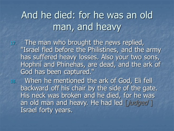 1 Samuel 4. The Philistines captured the Ark of God. Soon after that Eli died, and Phineas died and his wife gave birth to Ichabod, which means “No Glory”, for the glory had departed from Israel.