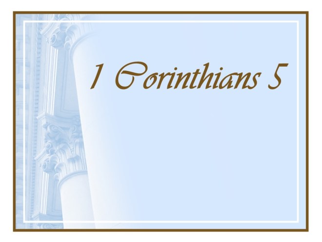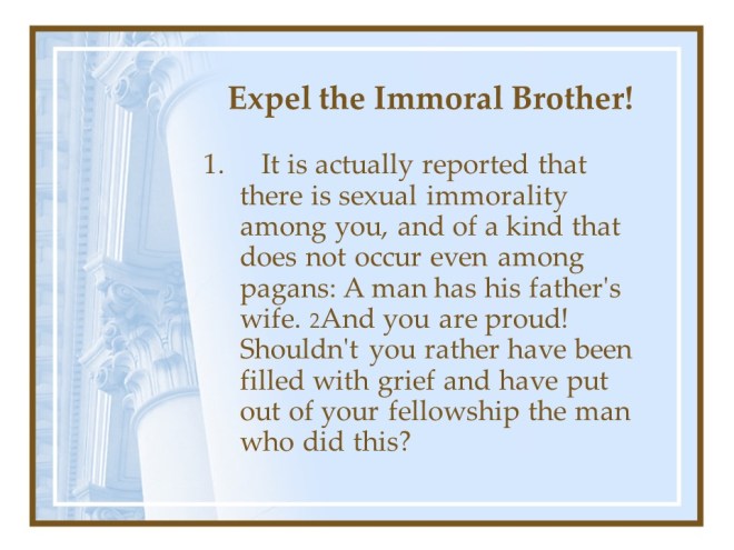 1 Corinthians 5. This is a stern chapter. The Apostle Paul reminded the Corinthians that immorality defiles the church. Immorality must be judged, and somebody that continues to so do must be expelled.